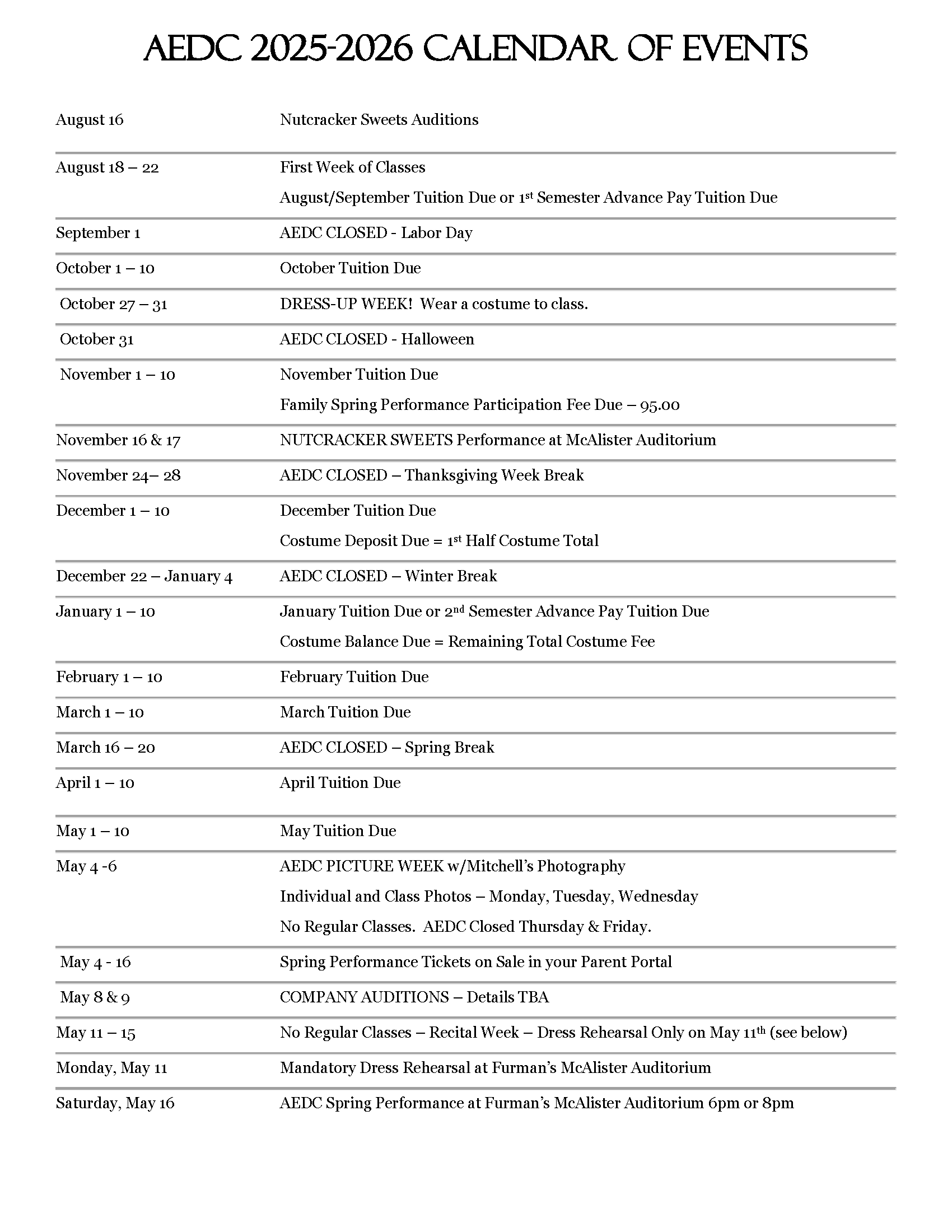 Calendar of Events